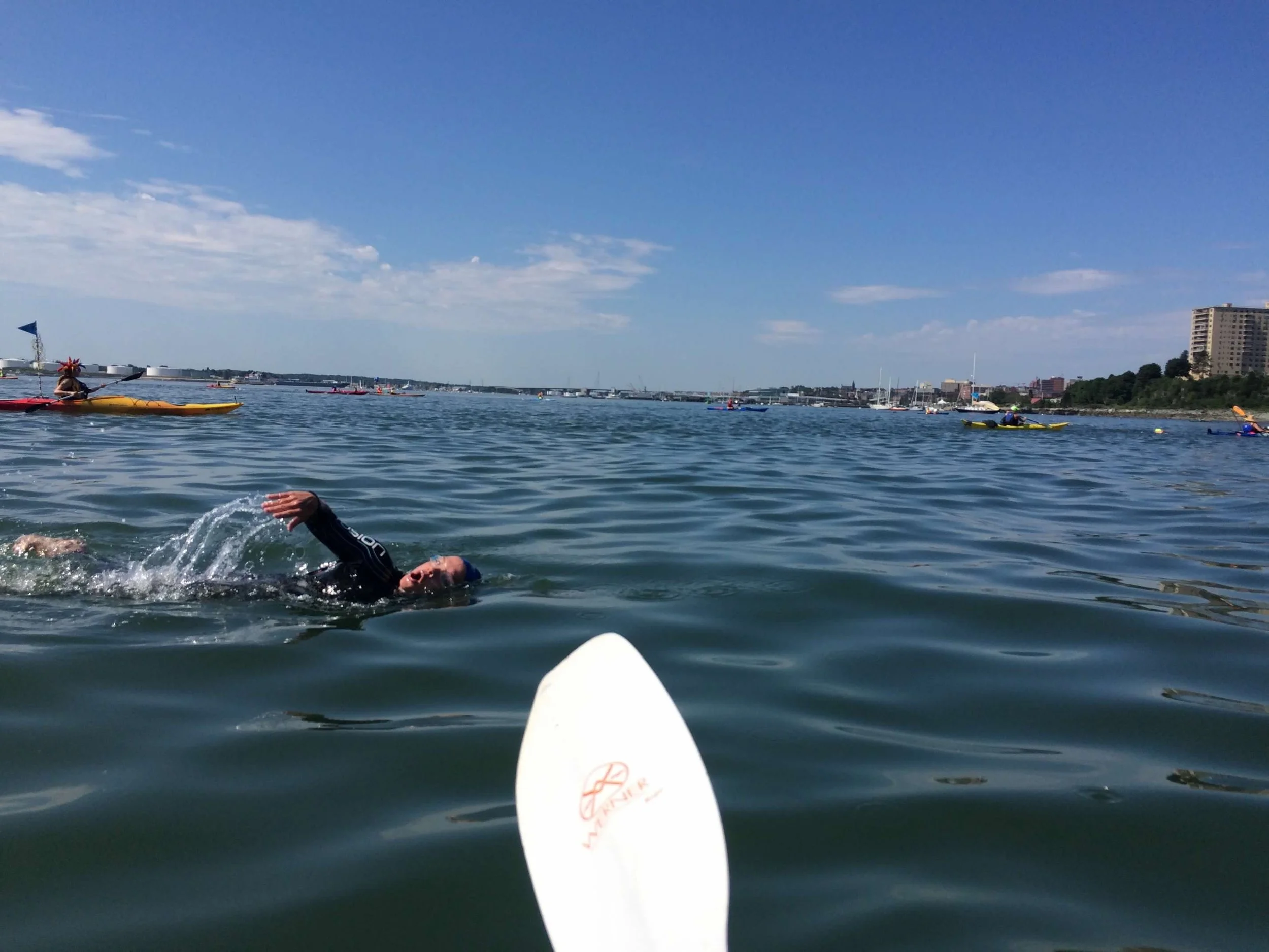 Kelly Fanning swimming Peaks to Portland — a 2.5 mile swim across Portland Harbor, Maine.